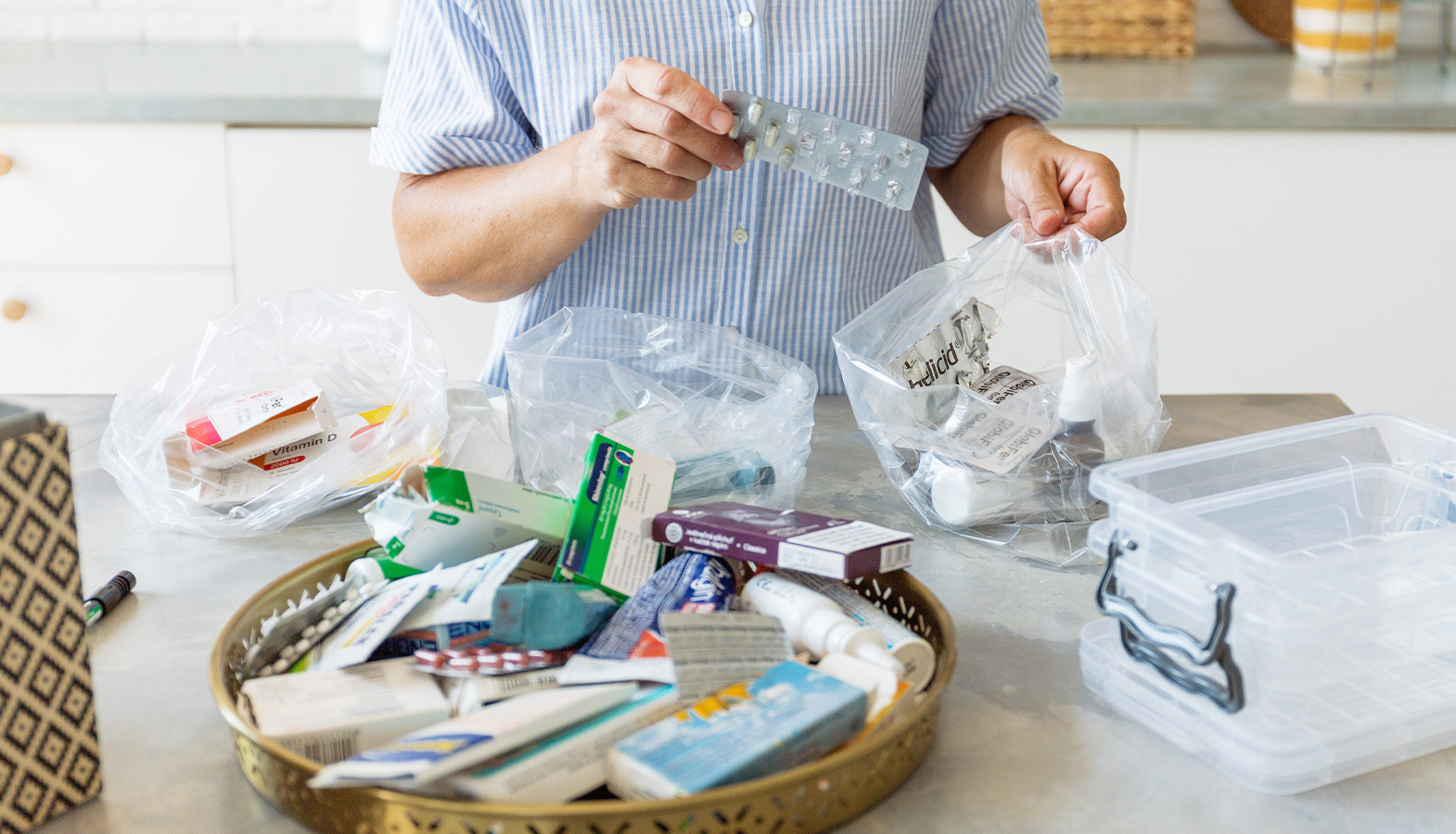 Stávající obsah domácí lékárničky je potřeba vyskládat na podložku. Já při vyndávání rovnou třídím, když už stejně každou věc beru do ruky. Do připravených pytlů nemilosrdně vyhazuji vše, co je prošlé nebo bez obalu, ale i platíčka, u kterých se datum expirace nedá vypátrat. Letí i načaté oční kapky (ty se většinou musí vypotřebovat zhruba do jednoho měsíce od otevření), nedobraná antibiotika (ta by vždy měl nově předepsat lékař), věci neznámého původu a taky ta domácí měsíčková mastička od kamarádky, kterou jsem měla dát do ledničky, ale nedala…