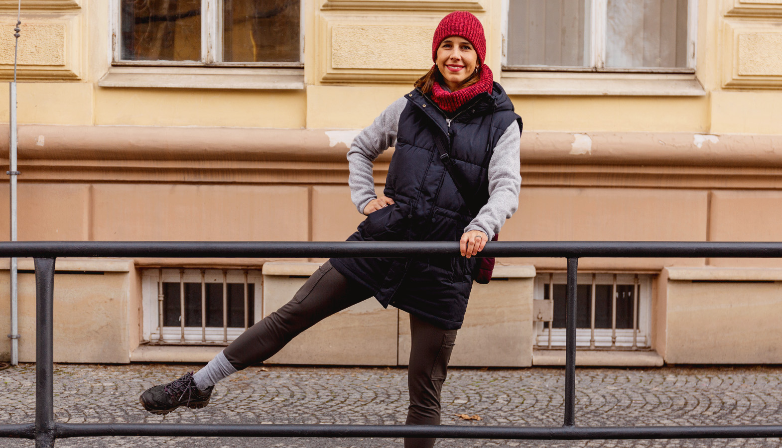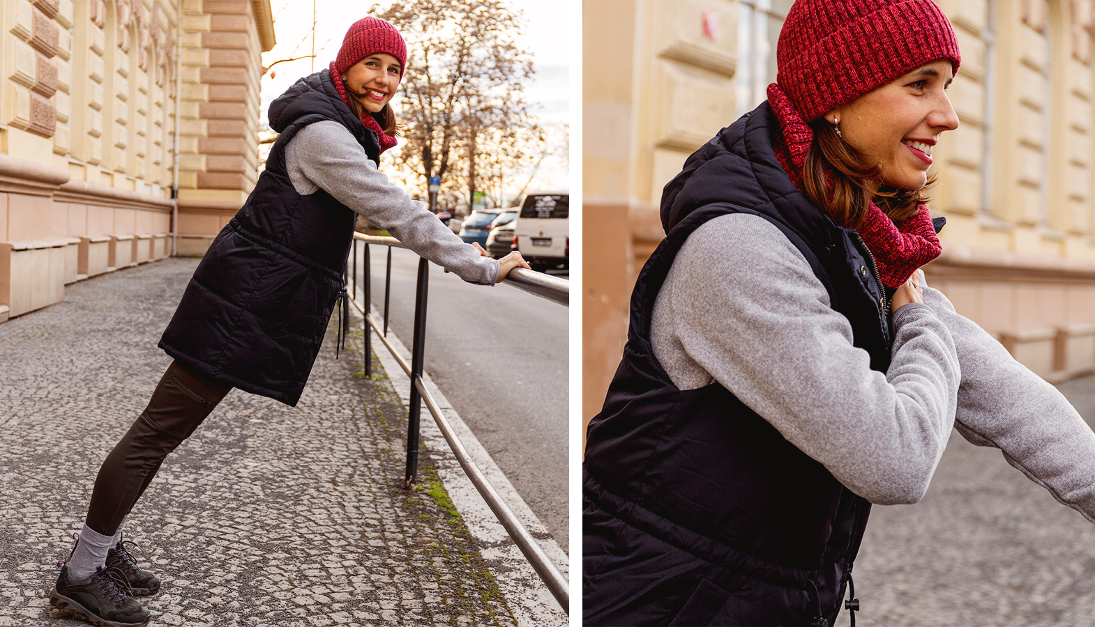 Začnu jedním z nejkomplexnějších posilovacích cviků vůbec – klikem. Vybrala jsem si jednodušší, řekněme průpravnou pozici pro klasický klik na podložce, a to klik o oporu v podobě zábradlí.