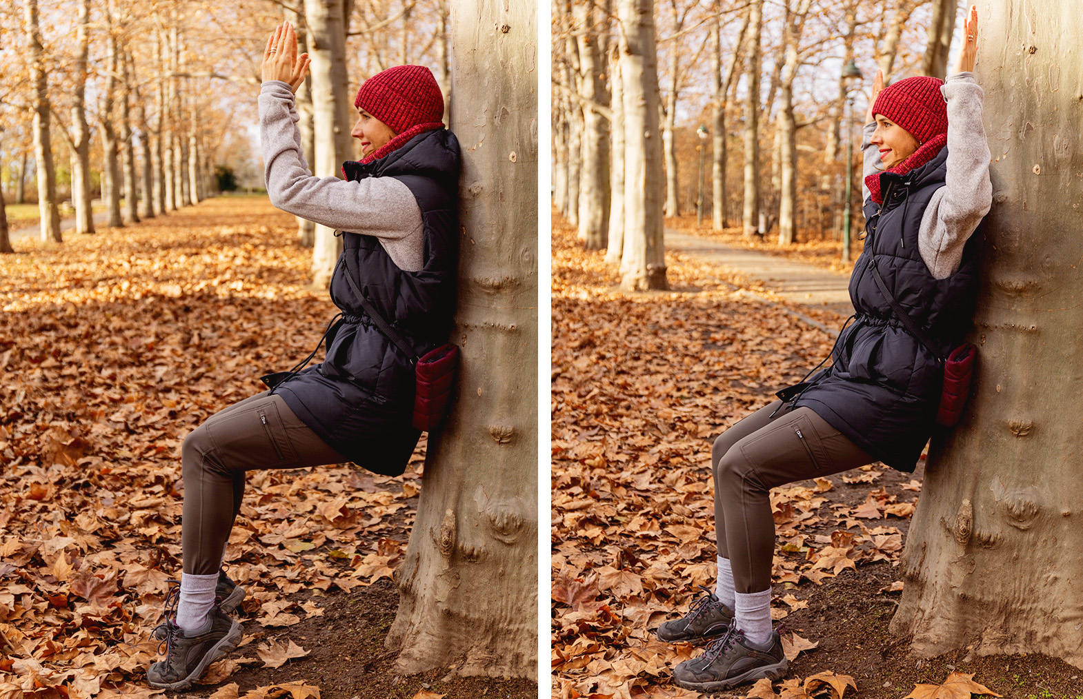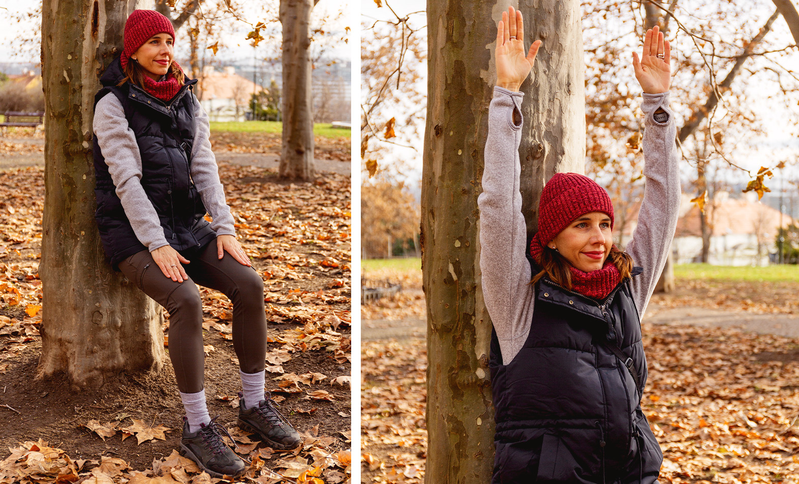 Pro další cvik nám jako cvičební pomůcka poslouží strom. Umístíme nohy na vzdálenost zhruba dvou chodidel od stromu a pokrčíme nohy do podřepu. O kmen opřeme záda a pohlídáme si, aby se nám kolena nedostala před špičky. Vytáhneme se z pasu. S nádechem ruce vzpažíme (dáme nad hlavu), s výdechem ruce přesuneme na stehna a zatlačíme jak dlaněmi proti stehnům, tak stehny proti dlaním. S nádechem uvolníme a opět vzpažíme.