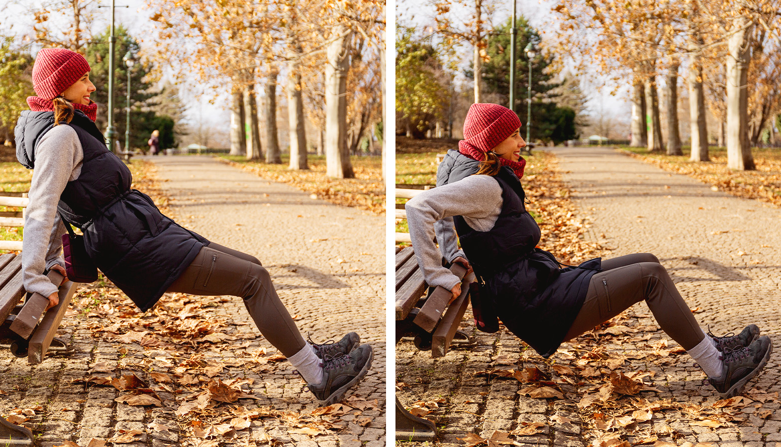 Přesouváme se na lavičku. Posadíme se a opřeme se dlaněmi o kraj lavičky. Pomalu sesuneme zadek z lavičky dolů. Ruce necháme natažené, stáhneme ramena dolů od uší a tělo držíme v ose. S nádechem pokrčíme ruce v loktech, s výdechem ruce opět napneme.