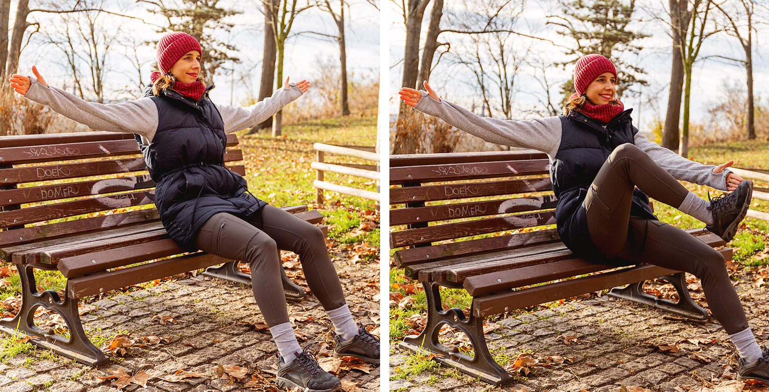 Sedneme si na kraj lavičky, vytáhneme se z pasu a ruce položíme podél těla. Nohy máme pokrčené před tělem, v podkolení je zhruba pravý úhel. S výdechem zvedneme jednu nohu a zároveň zatlačíme oběma dlaněmi do lavičky. Pokusíme seuhlídat si rovná záda. S nádechem uvolníme tlak dlaní a vrátíme nohu na zem. S dalším výdechem akci opakujeme od druhé nohy.