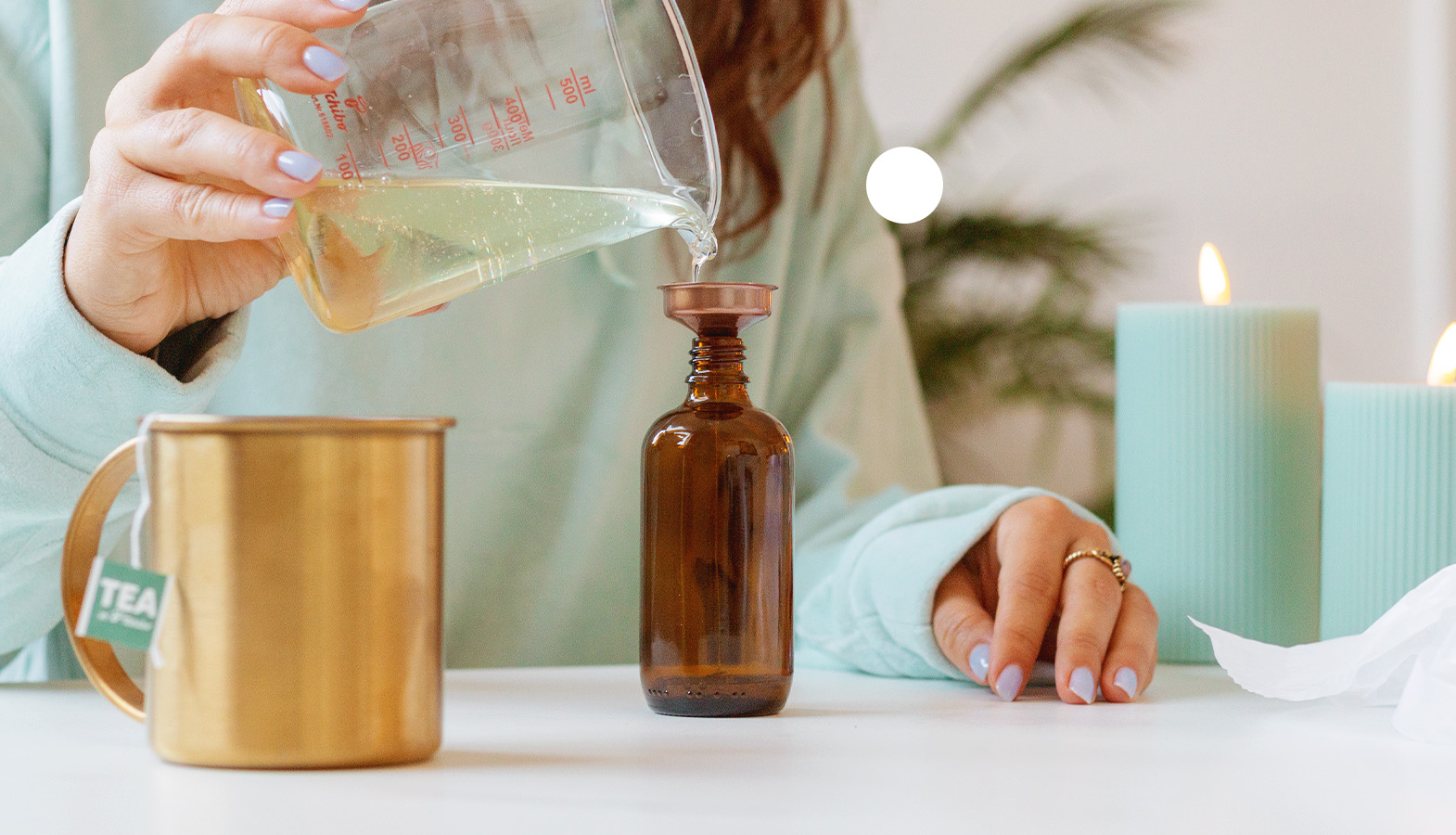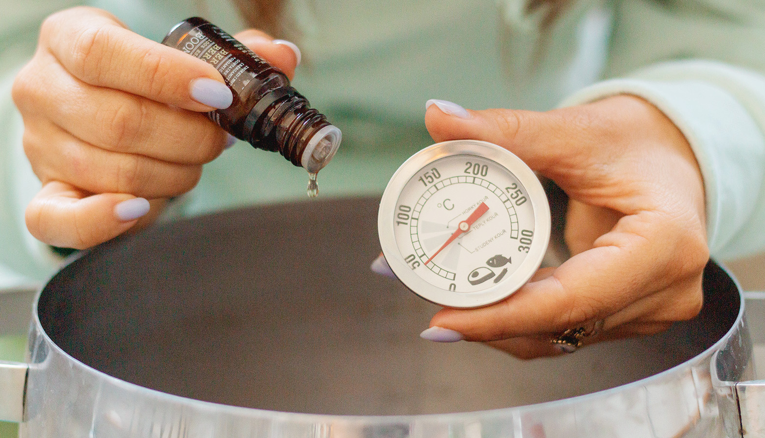 - Nechte vychladnout na 60 °C nebo méně a přidejte ostatní ingredience. (Při vyšší teplotě by se éterický olej akorát vypařil.)
