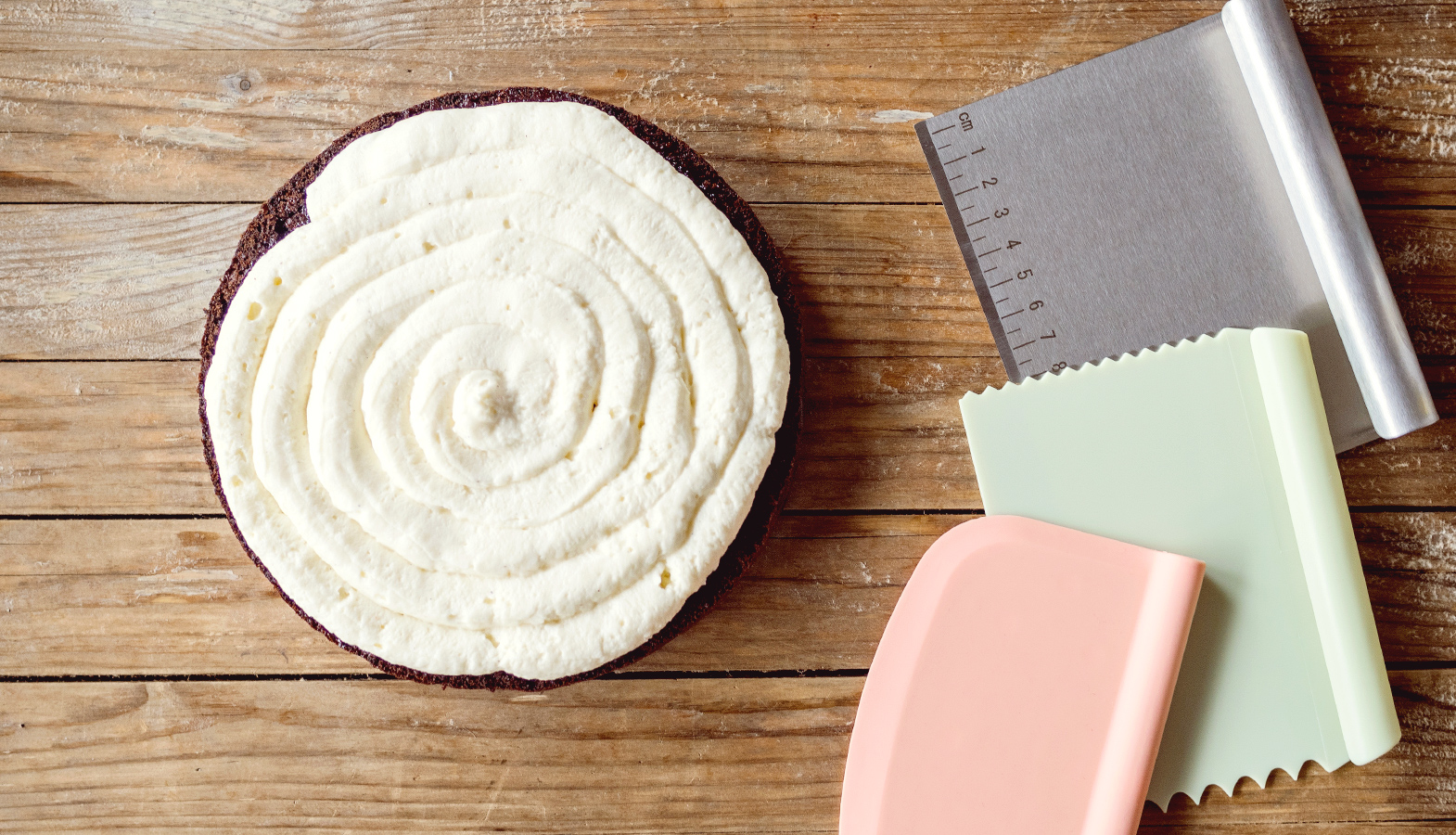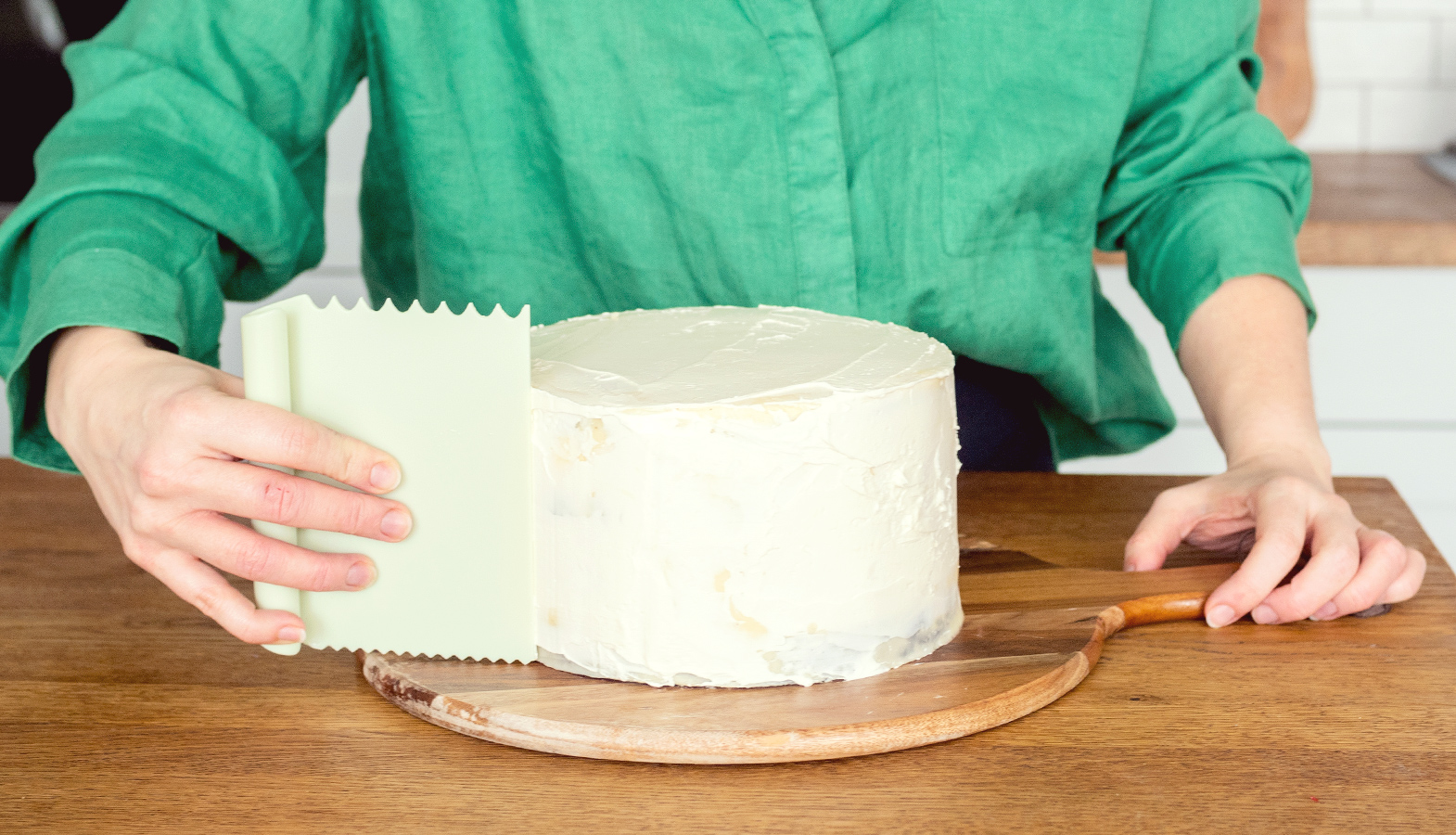 Hotový krém si rozdělte na dvě poloviny. S první neobarvenu polovinou krému potřete boky dortu i jeho vrchní část. Ideální je na to použít otočný stojan a stěrku.