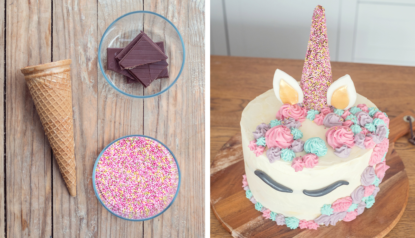 Jednorožčí roh můžete připravit dvojím způsobem. Můžete si pořídit fondán nebo marcipán a vyválet ho na dva válečky, které potom zamotáte a můžete je nastříkat třeba jedlým zlatým sprejem (nebo potřít zlatým práškem rozmíchaným v kapce vodky). Druhou a jednodušší variantou je v cukrárně koupit kornoutek, který potřete rozpuštěnou čokoládou a ještě za tepla posypete cukrovými kuličkami. Tento kornout poté umístěte doprostřed dortu.