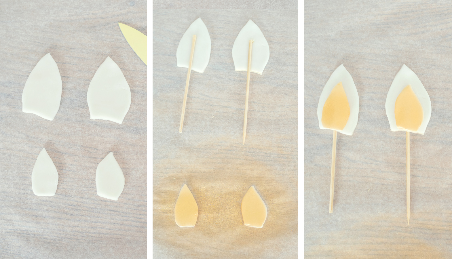 Co by to bylo za jednorožce, kdyby mu chyběly uši! Ty vytvoříte jednoduše pomocí fondánu nebo marcipánu, který si na pečicím papíře vyválíte a vykrojíte pomocí nože. Na každé ucho si vykrojíte jedno větší ucho a jedno menší. To menší nastříkejte zlatým sprejem a nechte zaschnout. Poté už stačí jen párátko nebo kus špejle. Na velké ucho položíte špejli, aby vám zasahovala zhruba do ⅔ ucha a poté ji překryjete malým uchem a přitlačíte. Pak už jen stačí zapíchnout uši ze stran ke kornoutu / rohu.