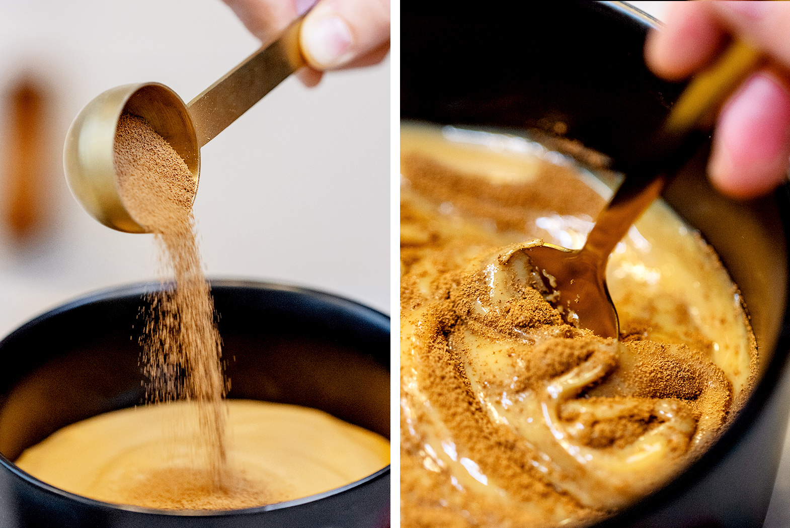 Po dvou hodinách vaření (a vychladnutí! :-)) se v plechovce vytvoří krémová karamelová hmota. Konzistencí připomíná toping a je skvělá třeba na pěnu cappuccina. Krásně se táhne.
