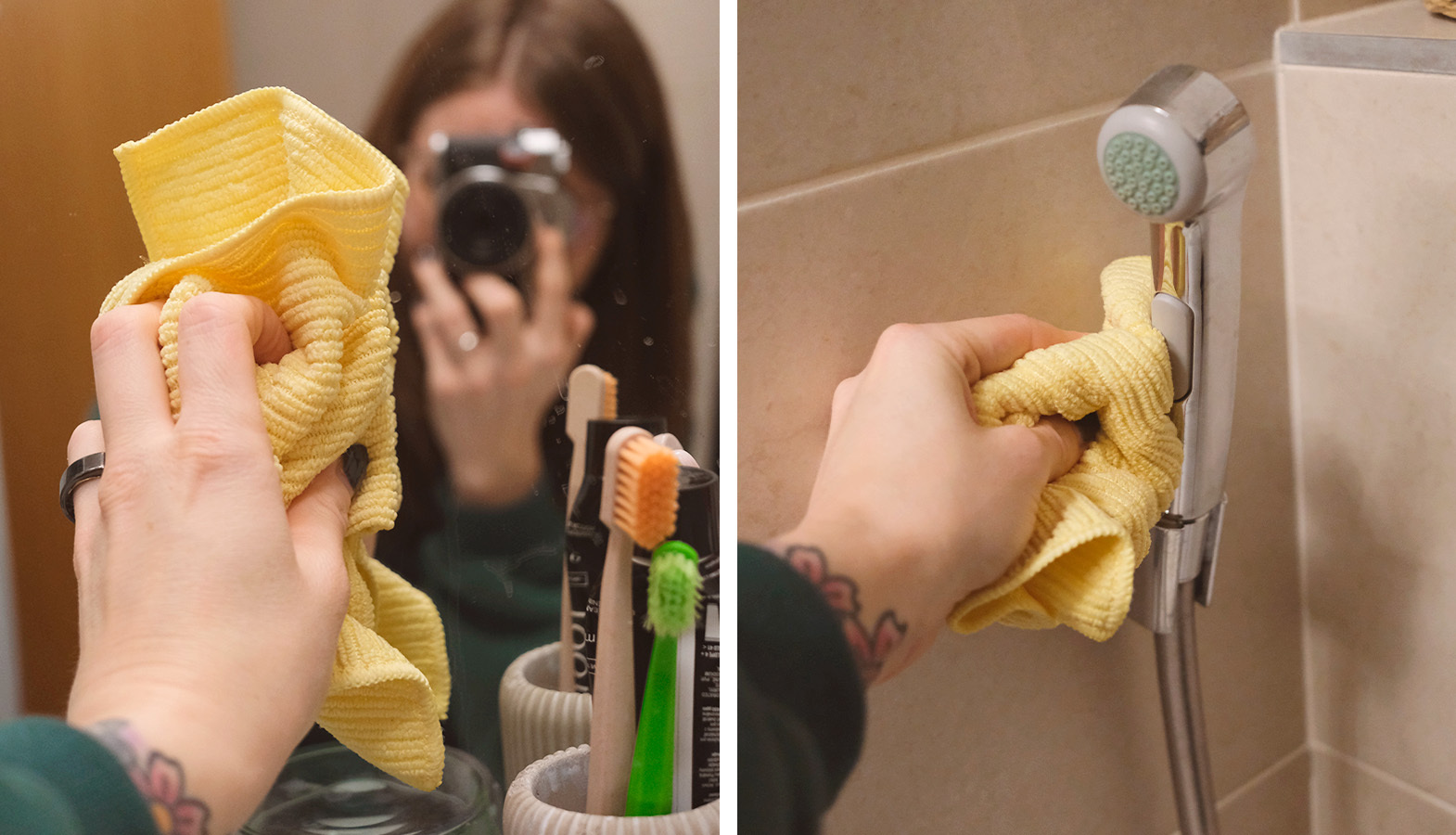 - Lesk blesk. Po čištění toalety si dopřejte nějakou hezčí činnost. Co třeba zrcadla? Ano! Každý má svoji oblíbenou lešticí metodu, já už léta používám zázračnou utěrku z mikrovlákna. Funguje skvěle na sklo i na nerezové baterie, a to bez čisticího prostředku. Zázrak. (2 minuty)
