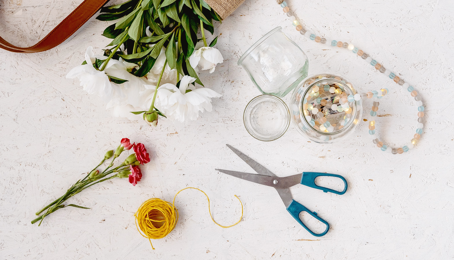 Sklenice: Vždy používám šroubovací zavařovačky, protože díky hrubému šroubovacímu okraji po nich provázky nekloužou. S hladkou skleničkou to je obtížnější. Doporučuji také hned nalít vodu – na zatížené vázičce provázek lépe drží.