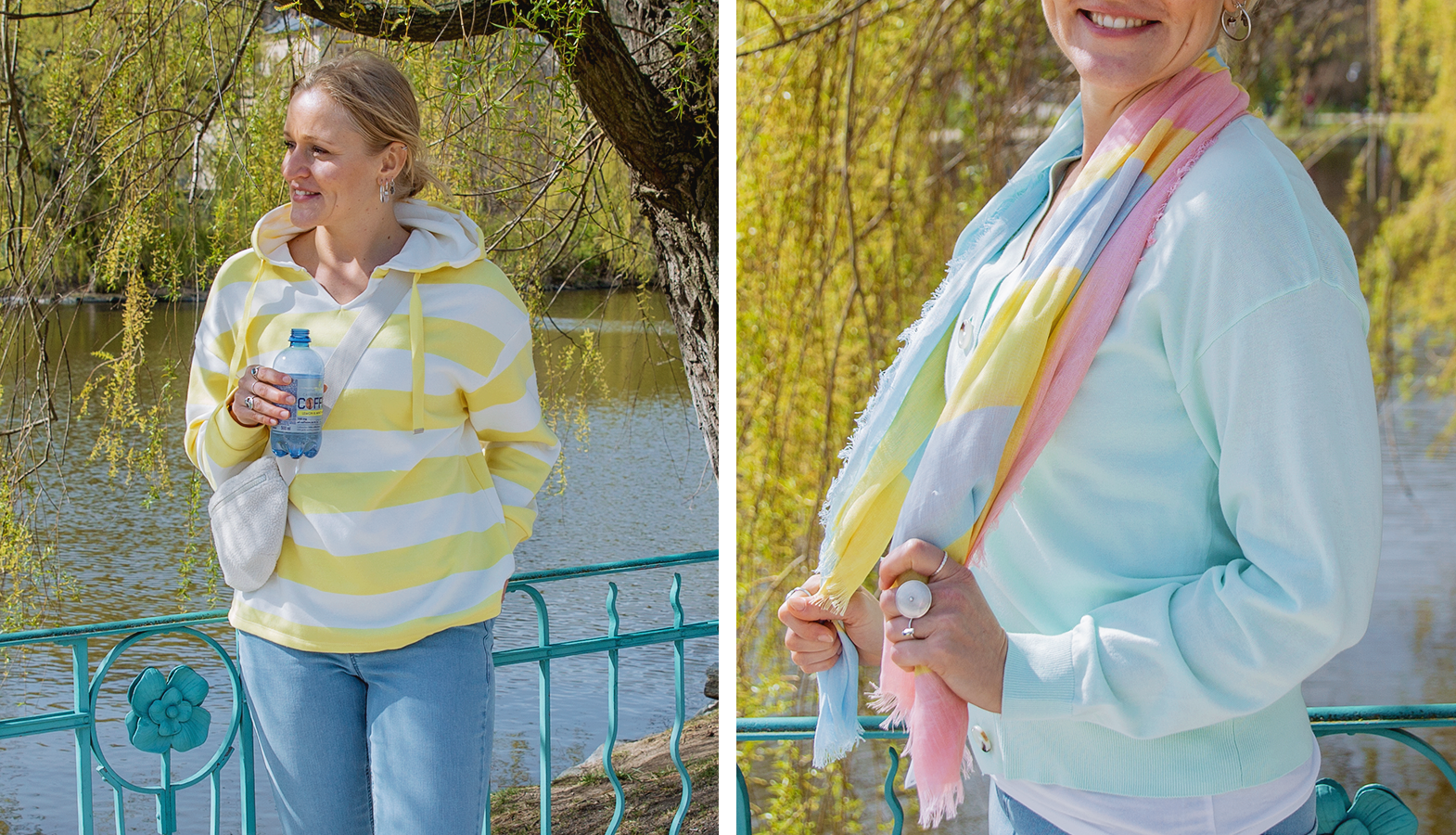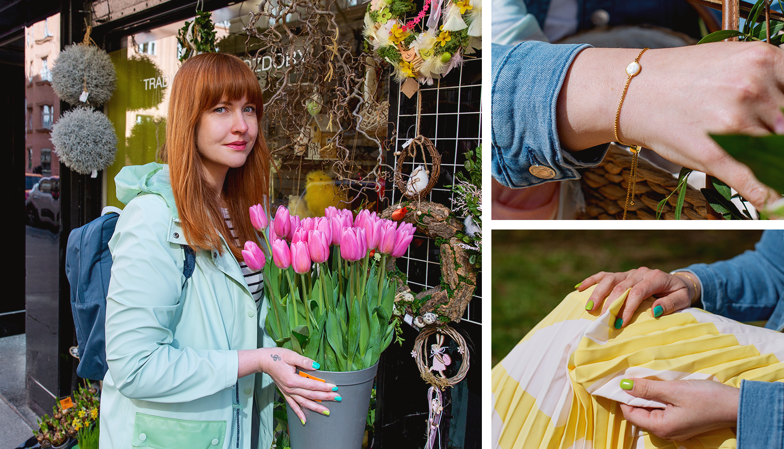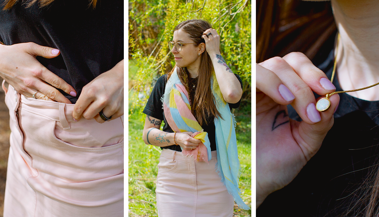 Když si oblékám jednoduchý outfit, jako je jednobarevná sukně a basic tričko, ráda ho zjemním doplňky, které mu dodají ženskost. V nové kolekci mě zaujaly šperky se syntetickým opalitem, který se v jarním sluníčku nádherně třpytí, a také pastelový šátek šitý ze lnu a viskózy. Šátkem můžete hezky osvěžit i kabelku nebo košík, se kterým vyrazíte na trhy.