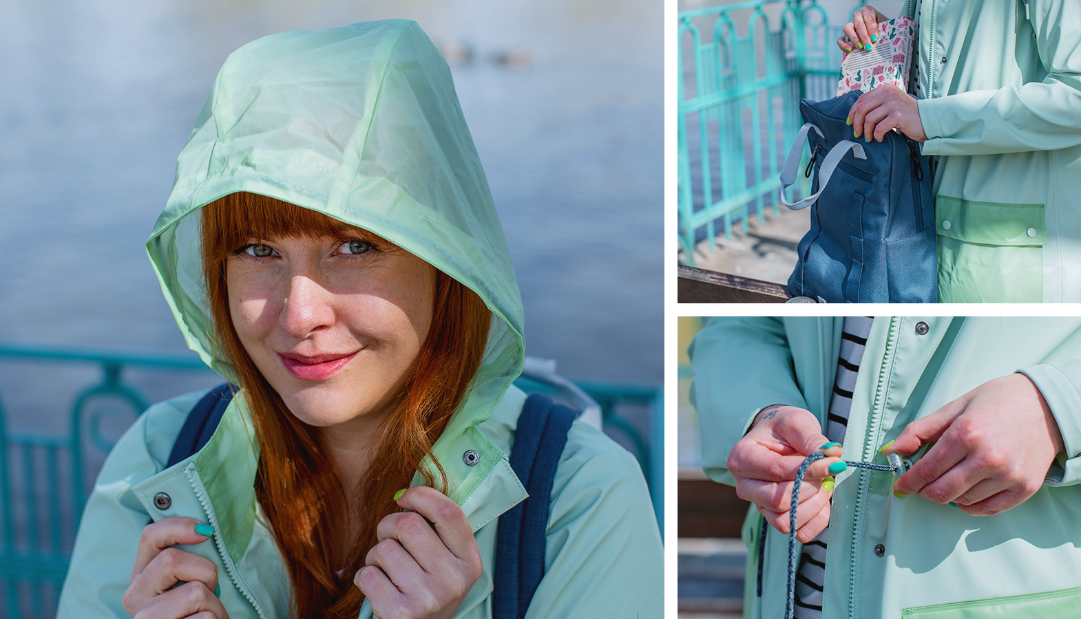 Přesto, že lačně hltám každý prosluněný den, musím počítat i s nečekanými aprílovými situacemi. Nejsem zrovna deštníkový typ a mnohem raději se před ledovou jarní sprchou schovám do pláštěnky. Pro tu jsem sáhla do kolekce z minulého týdne. Baví mě její mentolová barva i průhledné detaily v podobě kapes a stahovacího pásku. Pořizuji si vždy o číslo větší, abych pod ni mohla schovat menší batoh. Ačkoliv ten, co vidíte na fotkách, je vodoodpudivý.