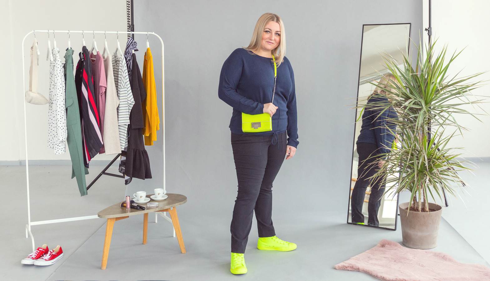 Byla by však škoda být celá zahalená do smuteční černé, když postačí třeba i doplněk, který outfit krásně osvěží. V našem případě jsme použily doplňky opravdu výrazné. Kombinace černých slim kalhot a tmavě modré pleteniny nahrává i něčemu tak výraznému, jako je například neonově žlutá, kterou jsem vybrala pro tento outfit. A hned je celek úplně jiný.
