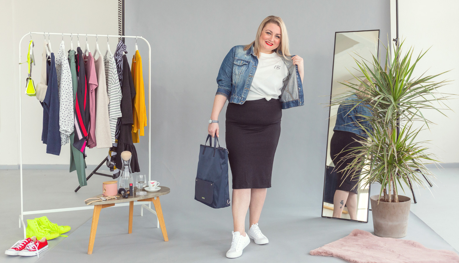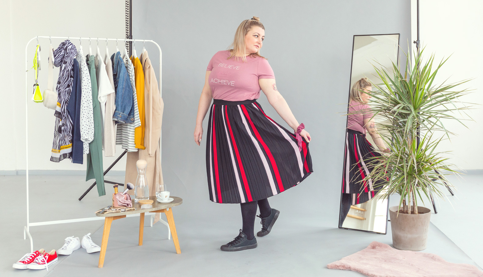 Kdo kdy řekl, že silnější postava nejde dohromady se sukní na tělo? Podle mě to vůbec nevadí, jen stačí vychytat, jak by měla vypadat. Ideální jsou ty, které jsou šité z bavlny a elastanu, protože nás neomezují v pohybu. U naší modelky můžete vidět sukni v délce ke kolenům a s vysokým pasem. Nejen, že zakryje bříško, ale opticky protáhne trup.