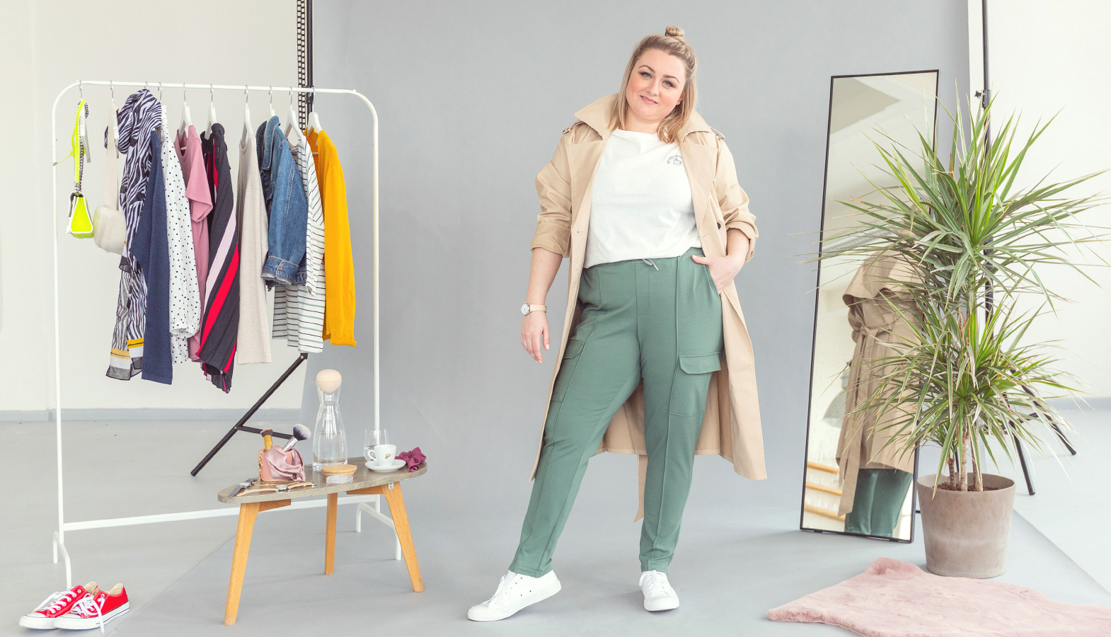 Na fotkách však můžete vidět, že jsme vybraly elegantnější variantu, kterou je jarní trenčkot. Protože v módě se meze opravdu nekladou a tepláky jsou za poslední rok opravdovým hitem, klidně se mohou kombinovat i s elegantním kabátkem a teniskami.