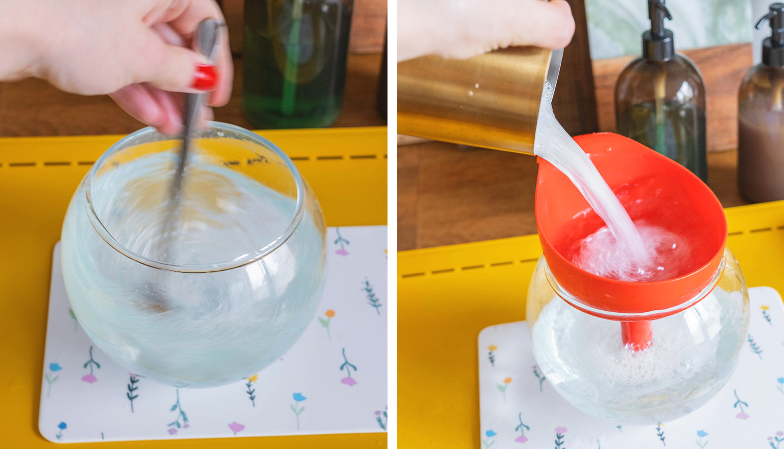Do kulaté mísy přidejte prostředek na mytí nádobí a lžičkou míchejte, dokud se voda pořádně neroztočí. Pak už jen pozorujte, jak vzniká vodní vír, hladina se prohlubuje, jak se voda točí a vyvíjí se před tím, než se zase ustálí. Pak můžete pokus zopakovat s trychtýřem. Rychle do něj nalijte vodu promíchanou s prostředkem na nádobí a pozorujte.