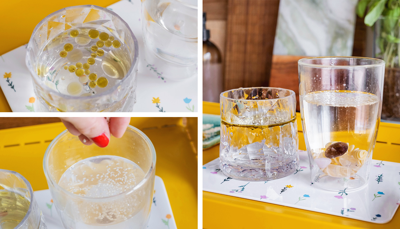 Do vody přidejte několik lžic oleje a pozorujte, jak se tvoří očka na hladině. Pak olej do vody důkladně zamíchejte a sledujte, jak se očka zase postupně usadí na povrchu. Do druhé sklenice postupně vkládejte různé předměty a zkoušejte tak, které klesnou ke dnu a které budou plavat. Opět můžete vodu trošku obarvit potravinovým barvivem pro ještě výraznější efekt.