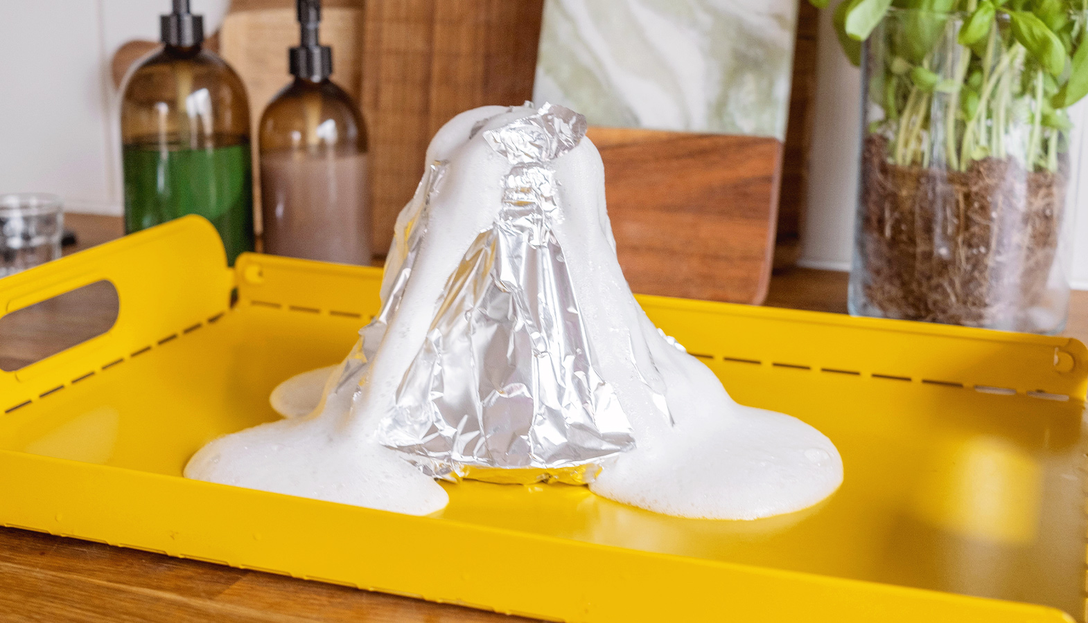 Na výrobu sopky si vystačíte s obyčejnou sklenicí a talířem, ale můžete to dotáhnout k dokonalosti tím, že vše dozdobíte alobalem (sklenici postavíte do talíře a vše přetáhnete alobalem, ve kterém pak v místě otvoru sklenice uděláte stejně velký otvor). Pozor, pokus dělejte ve dřezu nebo na tácu, protože sopka pravděpodobně přeteče.