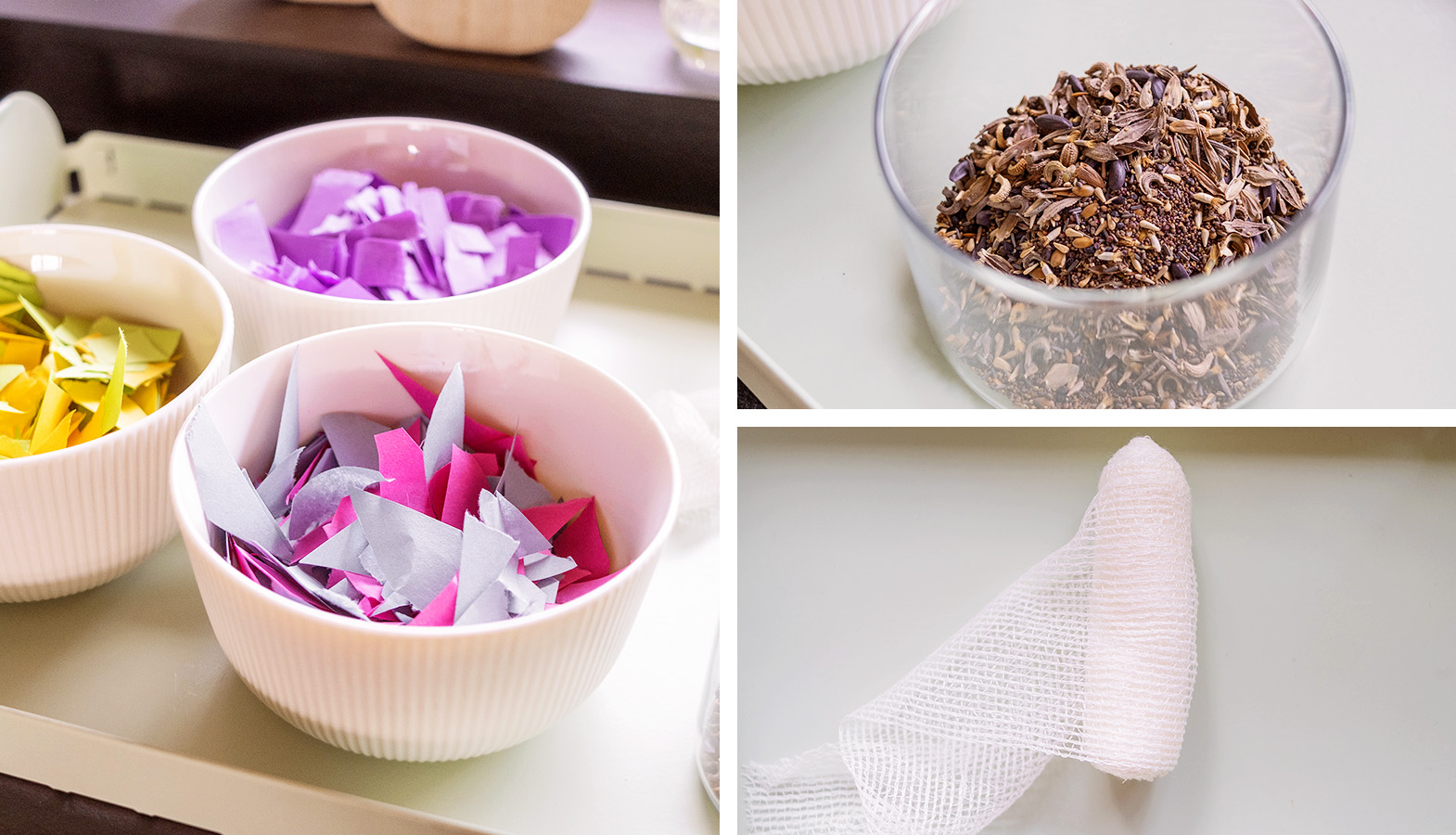 Když se rozhodnete pro noviny, volte ideálně černobíle tištěné. Obecně se vyhýbejte lesklým papírům, barevnému tisku a podobně. Novinový papír můžete přibarvit například potravinářskými barvičkami, které jsou pro přírodu neškodné. Jen potom na práci doporučuji použít rukavice.
