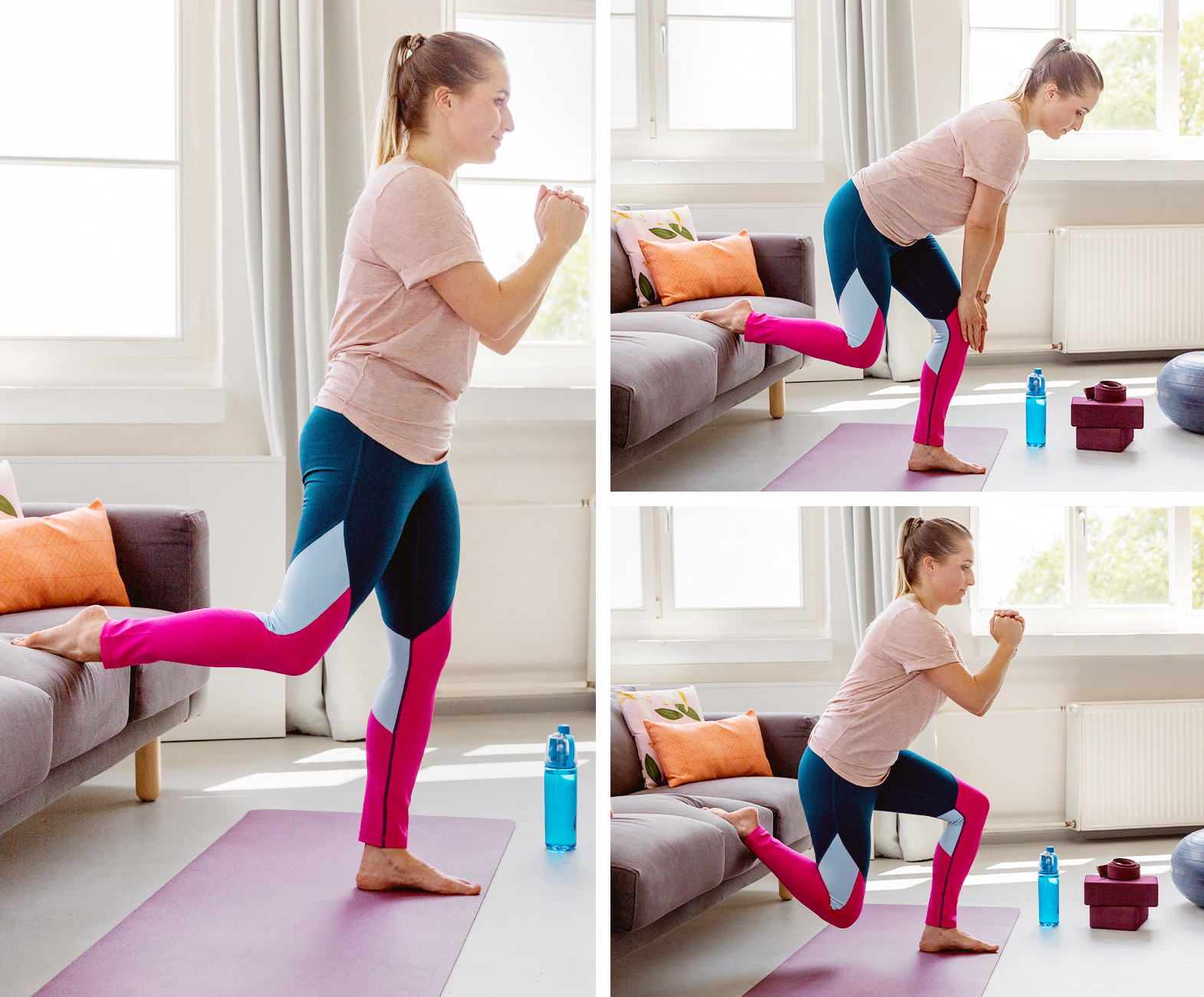 RFESS mrtvý tah a dřep: Hlava je stále v prodloužení páteře, v horní pozici máte podsazenou pánev, lehký náklon dopředu a pevný střed těla. První je mrtvý tah, kde si pomůžete rukama na stehně, ohyb je v kyčli – pokrčíte koleno a natáhnete hamstring (je to, jako kdybyste zadkem chtěli zavřít dveře), potom z této pozice jdete dolů do dřepu a zase nahoru. Na každou stranu 10 dřepů.