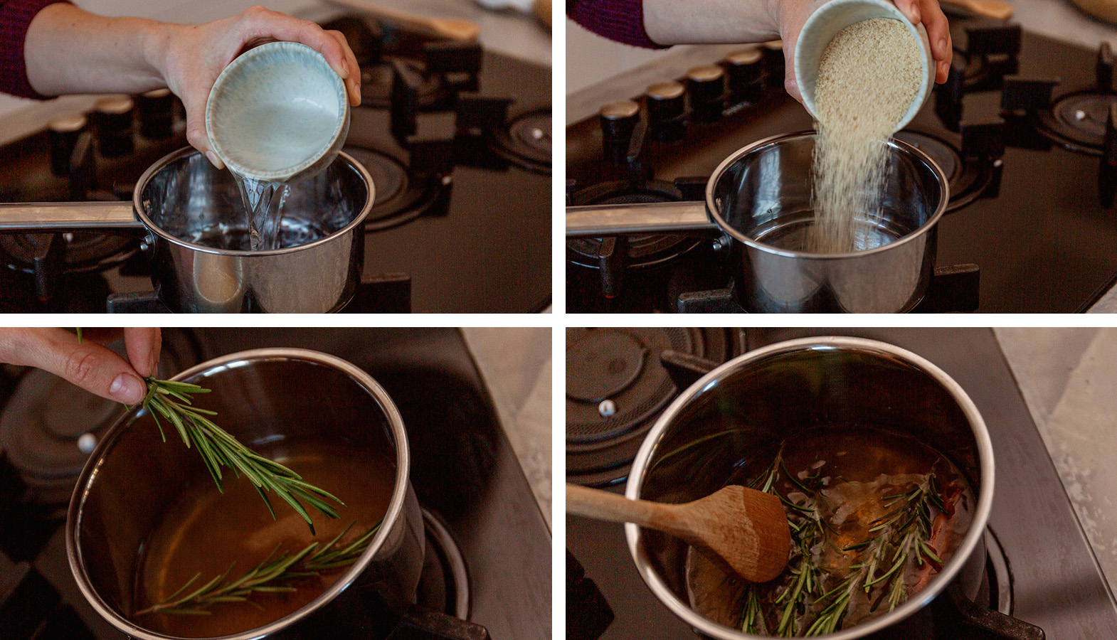 - Do menšího hrnce dejte rozmarýn, skořici, cukr a vodu a nechejte vařit na středním plameni.