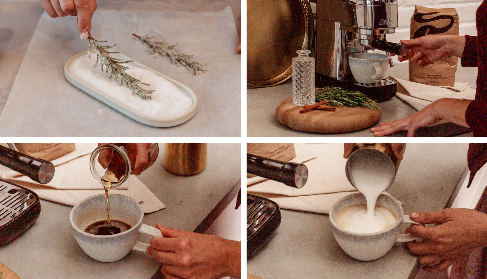 Až budete mít sirup hotový, připravte si do většího šálku espresso, přidejte sirup podle chuti a směs zalijte našlehaným mlékem. Zdobení je pak na vaší kreativitě. Já se před návštěvou vytáhla rozmarýnem v cukrové krustě a pěnou s lehkým popraškem skořice.