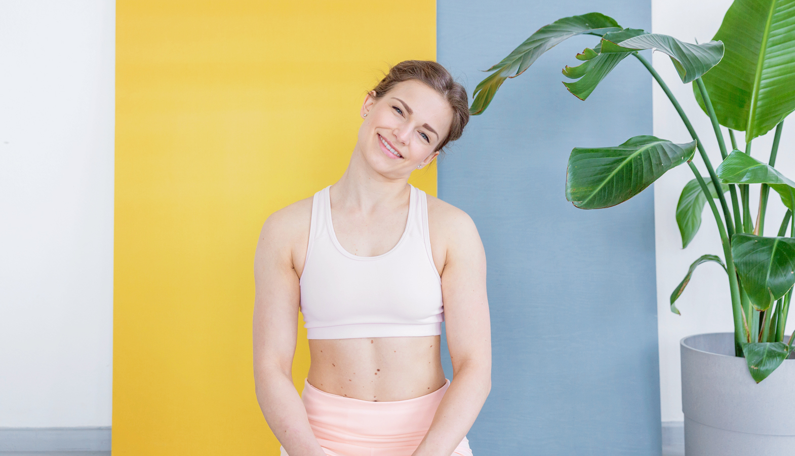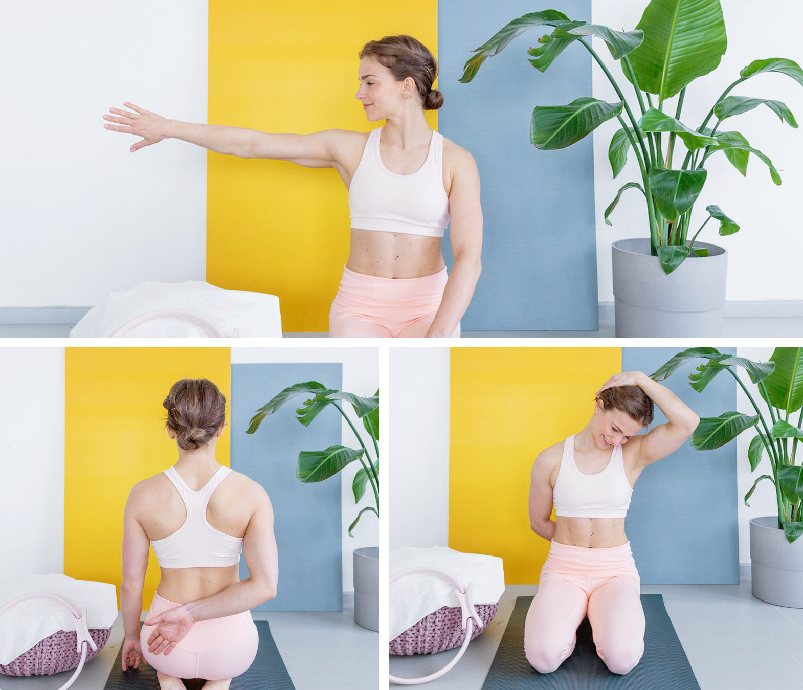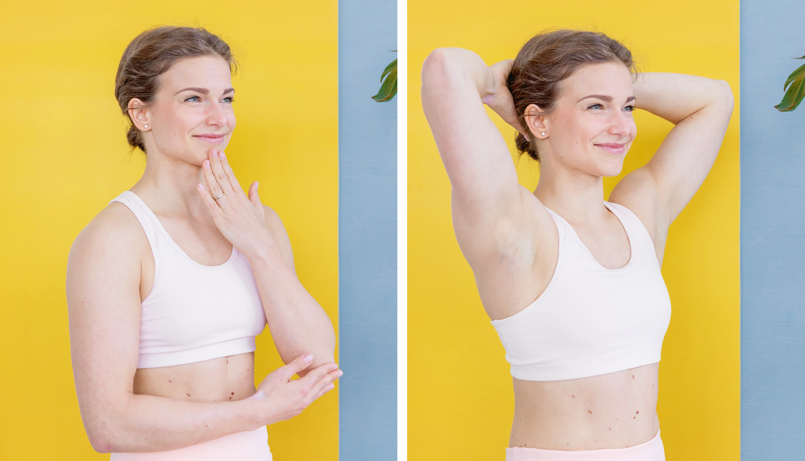 Lehněte si na masážní válec tak, abyste ho měli přímo na lopatkách, ne v místě, kde končí hrudní koš a začínají bedra. Hlavu zakloňte, a pokud by to bylo nepříjemné, položte si ji na bloček. Zvedněte ruce ke stropu, propněte je v loktech a otočte tak, aby palce směřovaly za hlavu. Provádějte vzpažení, dbejte na to, aby hrudník zůstal neutrálně postavený – aby se žebra nerozevřela směrem ke stropu. Ve vzpažení vydržte několik nádechů. Vyzkoušet můžete i obměnu: pokrčte ruce a chytněte se za protější lokty.