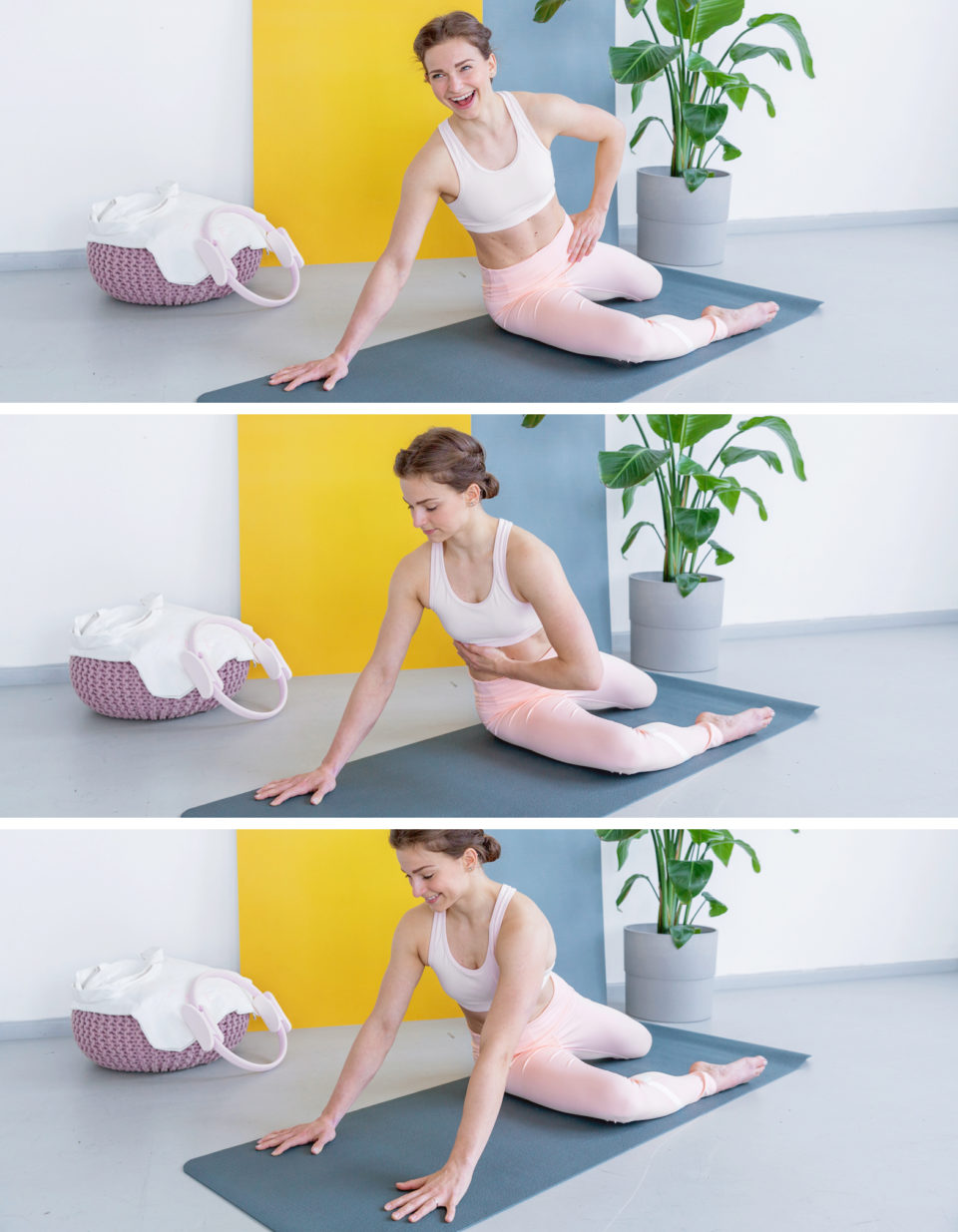 Posaďte se do šikmého bočního sedu (překážkového sedu) s pravou nohou pokrčenou před tělem. Pravou dlaň položte na podložku vedle pánve ve vzdálenosti asi 40–50 cm a pevně se o ni opřete. V trupu se budete muset naklonit do strany, ale pokuste se u toho do strany neprohýbat. Začněte rotací trupu dopředu, levou rukou veďte rotaci od levé poloviny pánve přes pupík k pravé straně žeber, jako byste chtěli celý trup ještě o trochu víc pootočit. Pak levou ruku položte na podložku vedle pravé tak, abyste z dlaní a pravého stehna vytvořili obdélník. Podržte alespoň 6–8 nádechů, opakujte na druhou stranu.