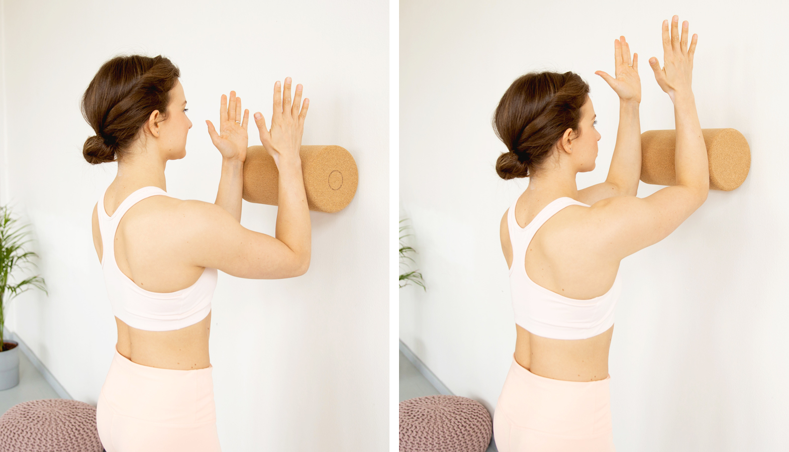 Postavte se vzpřímeně čelem proti zdi, vezměte válec a umístěte ho mezi zeď a vaše zápěstí tak, aby byl zhruba ve výši vašich ramen. Ramena stočte do zevní rotace, lokty se snažte držet u sebe, předloktí opírejte o válec malíčkovou hranou. Začněte po válci rolovat ruce směrem vzhůru tak, abyste stále udrželi neutrální postavení trupu a zevní rotaci ramen. Pohyb kontrolujte i směrem dolů. Opakujte 4–6krát, odpočiňte si, pak zkuste znovu.