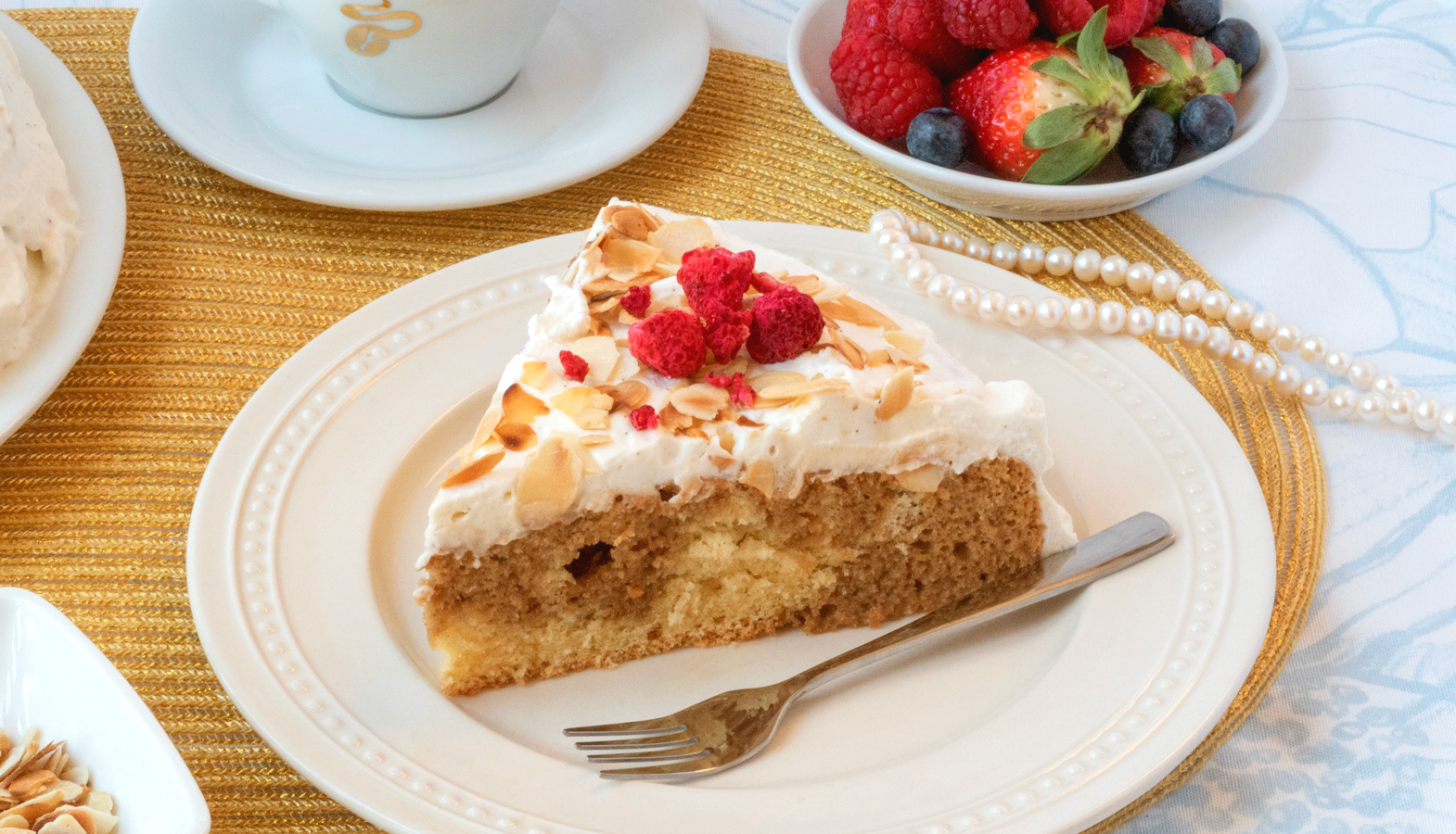 - Uleželý dort vyndejte z formy a potřete šlehačkou ze všech stran. Posypte opraženými mandlemi a servírujte.