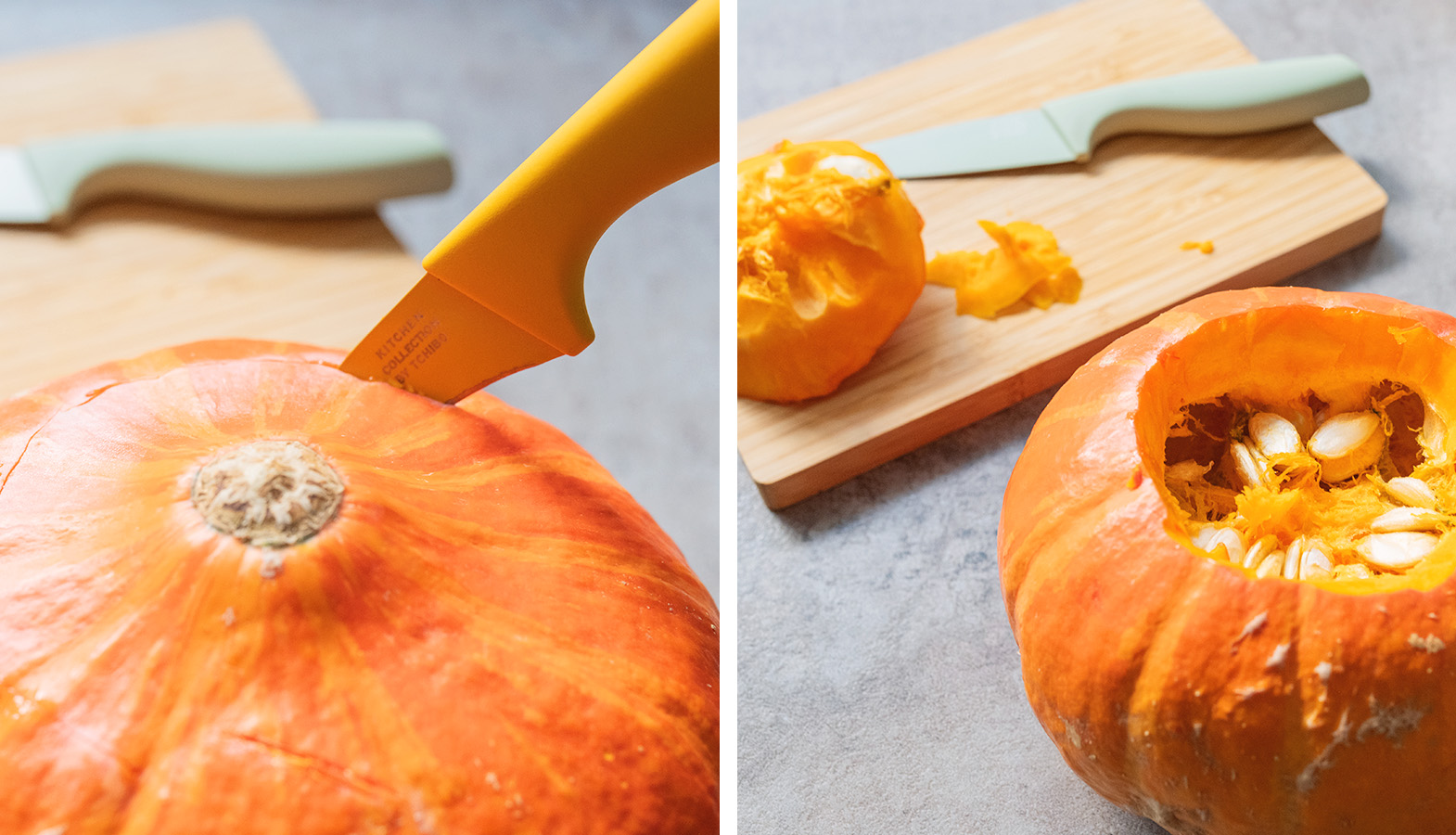- Příprava dýně: Začneme tím, že vybereme dýni s rovnou základnou, aby byla stabilní. Ostrým nožem odřízneme horní část dýně – řez by měl být rovný a dostatečně široký, aby se dovnitř vešla sklenice nebo váza.