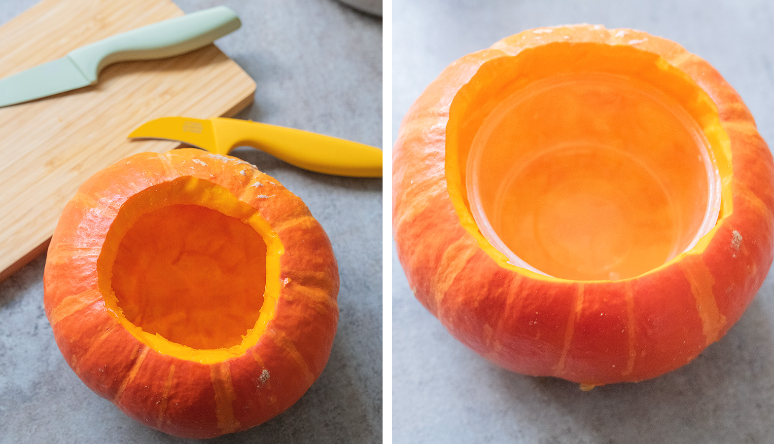 - Vložení nádoby: Do vydlabané dýně vložíme sklenici nebo vázu, která bude držet vodu. Sklenice by měla být těsně uvnitř dýně, aby nepůsobila neesteticky a dýně měla kompaktní vzhled.