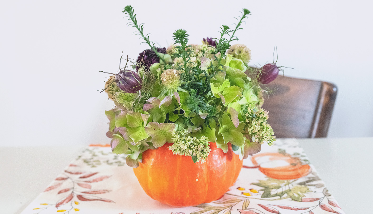 - Květiny: Podzimní květiny, jako jsou chryzantémy, jiřiny, eukalyptus nebo třeba traviny a cokoli najdete v truhlíku nebo na zahradě.